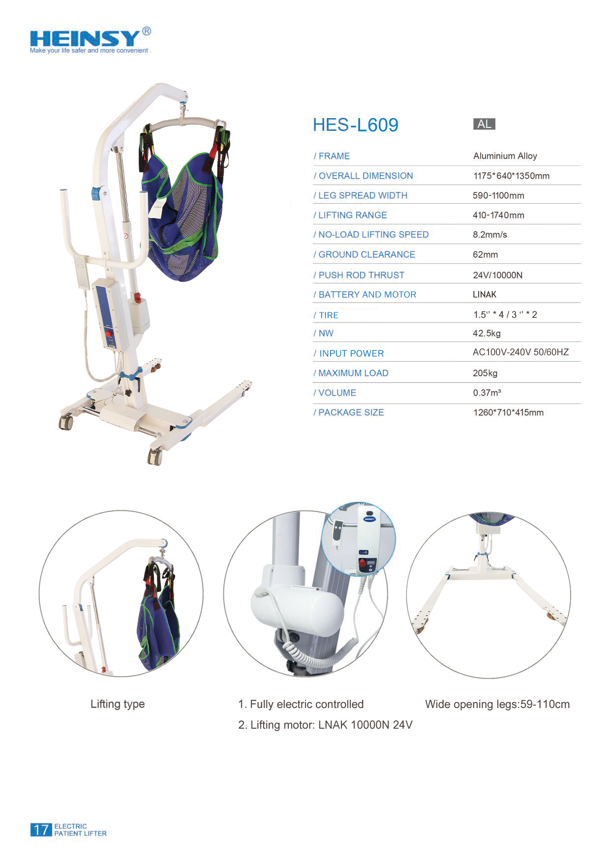 Kao naš glavni proizvod, potpuno automatska dizalica L609 zaslužila je Jamesovu veliku pohvalu za svoje vrhunske performanse i dizajn jednostavan za korištenje. Koristi LINAK motor za stabilan i pouzdan rad. Električni upravljački sustav jednostavan je za korištenje, uvelike olakšavajući iskustvo operatera njegovateljima . Podesiva širina otvora za noge od 59-110 cm omogućuje fleksibilnu prilagodbu različitim scenarijima. Snažni LINAK 10000N 24V motor za podizanje osigurava sigurno i glatko podizanje. ( Obje noge nude iznimno nizak razmak od tla od 6,2 cm, što omogućuje glatku prilagodbu različitim scenarijima niskog kreveta. )