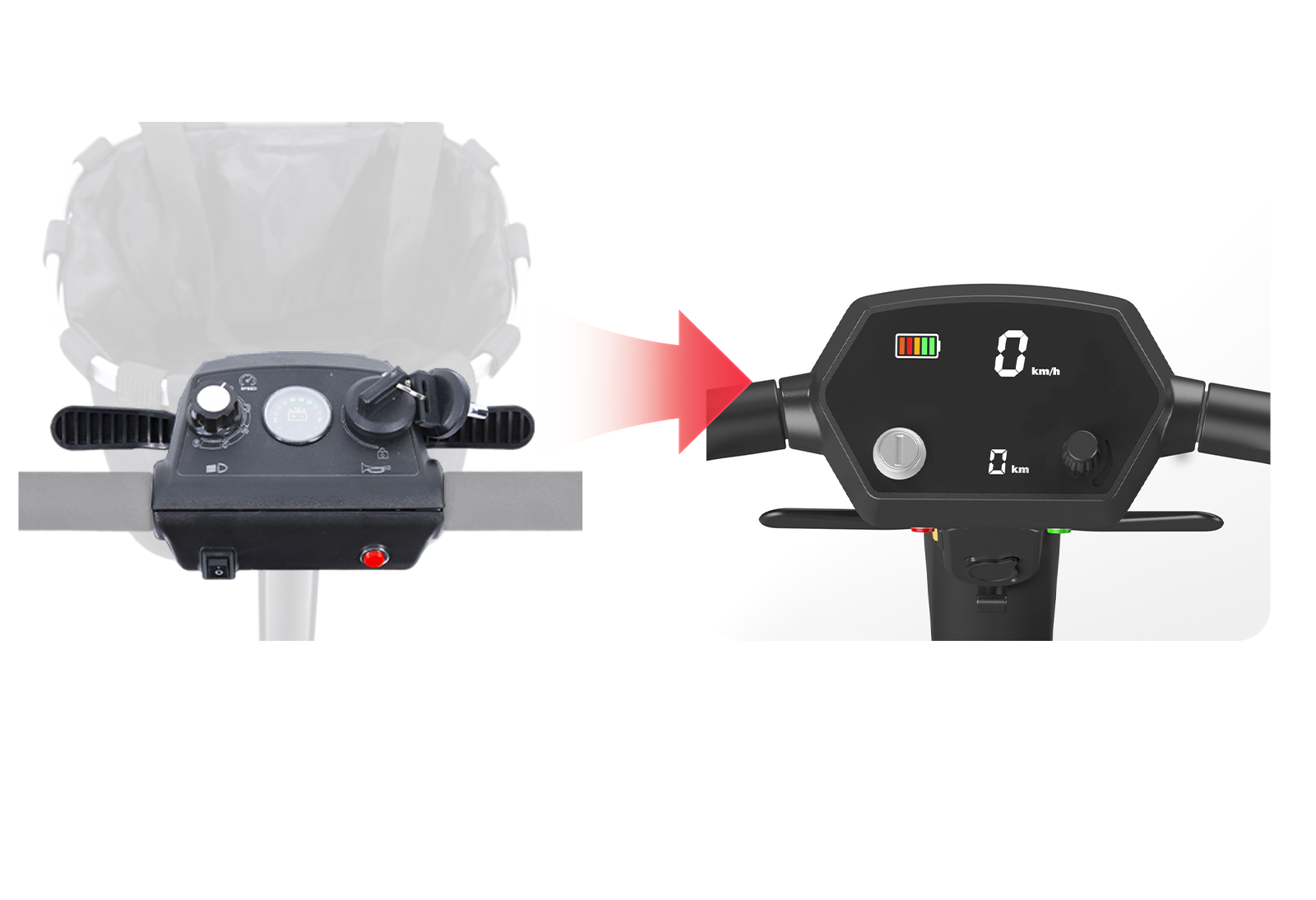 Izvorni analogni indikatori baterije i brzine nisu prikladni za starije korisnike sa slabim vidom. Nadograđena verzija ima LED digitalni zaslon visoke razlučivosti**, koji točno prikazuje trenutnu brzinu, preostalu bateriju i način vožnje u stvarnom vremenu. Razina baterije jasno je označena s tri boje: zelenom, žutom i crvenom, pružajući vizualni podsjetnik za punjenje kada je niska. Prikaz brzine je precizan do 0,1 km/h, a pomoću gumba za podešavanje brzine (podesiv od 2 do 8 km/h), korisnici mogu preciznije kontrolirati svoj ritam vožnje, izbjegavajući neugodnost fluktuacija brzine.