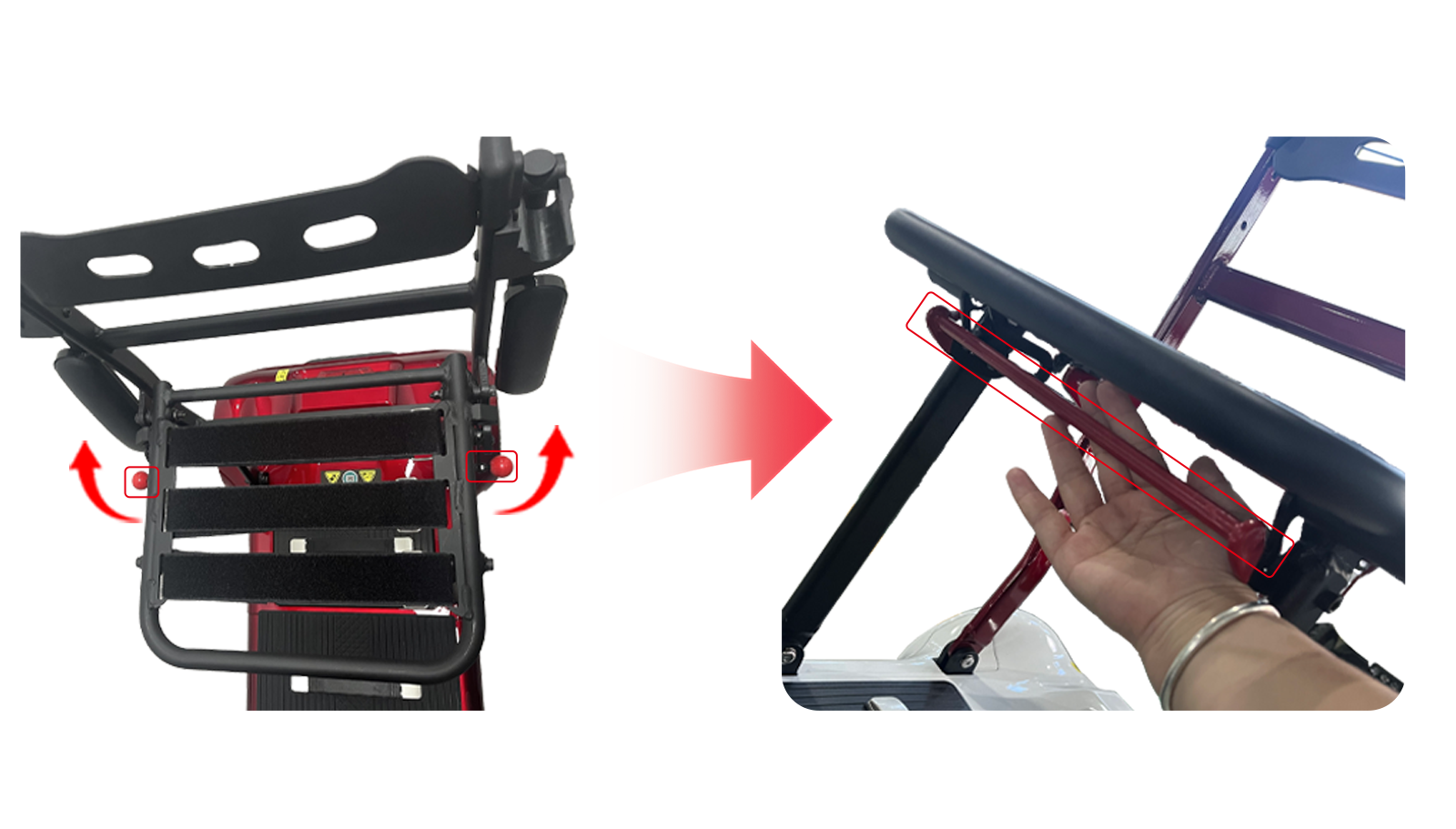 Metoda dvoručnog sklapanja izvorne verzije može biti nezgodna za korisnike s ograničenom snagom ili jednom rukom. Nadograđena verzija ima inovativni "mehanizam za sklapanje jednim dodirom, jednom rukom"**. Jednostavnim pritiskom na zasun za preklapanje sjedala jednom rukom preklapaju se okvir i sjedalo istovremeno u 10 sekundi. Kompaktna sklopljena veličina olakšava starijim osobama koje žive same pakiranje ili članovima obitelji spremanje u prtljažnik automobila, doista postižući "laganu pohranu za praktičnu vožnju".